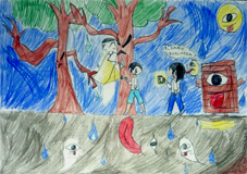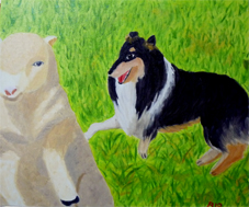 ひと通り色鉛筆で塗った上に、さらに絵具で仕上げるという根気は、ふみかちゃんにしか出せません。気持ちのよい広〜い原っぱを、わんちゃんが走っています。
